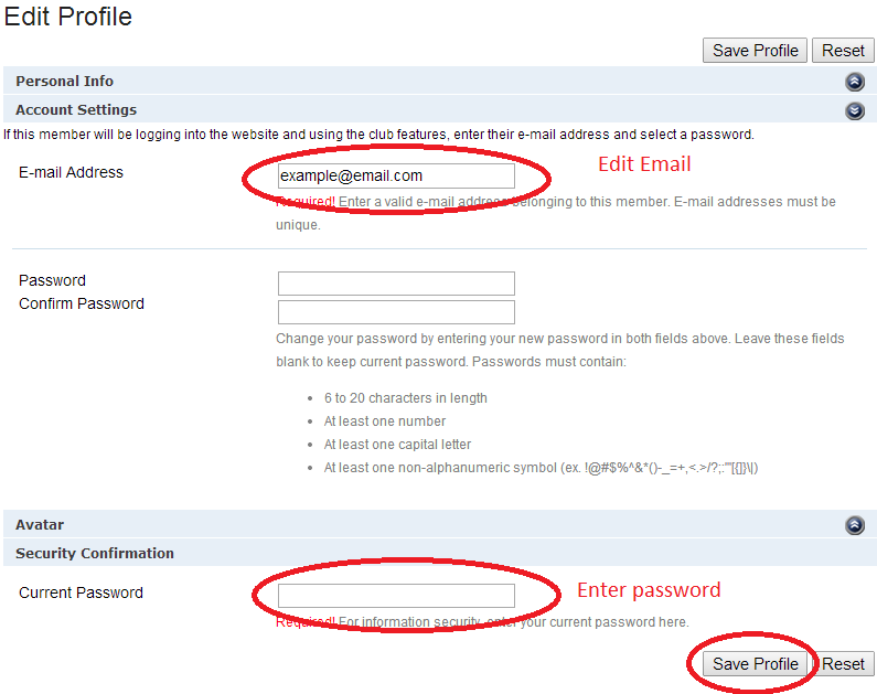 After Login - Select Edit Profile from the Menu - Edit Email as Shown Below